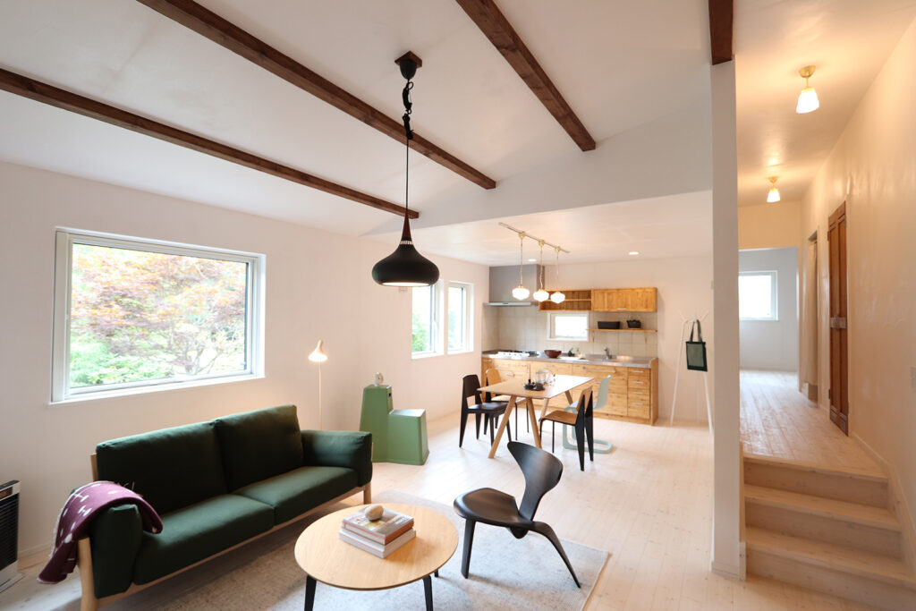 会場は、住宅街の一角に立つリノベーション住宅。本州から北海道への移住を叶えたご夫妻が暮らす、築43年の木造平屋建てです。延床面積は約33坪とゆとりの広さ。LDKはゆとりの広さで、ゲストの滞在時にも便利な4.5畳の和室も併設しています。